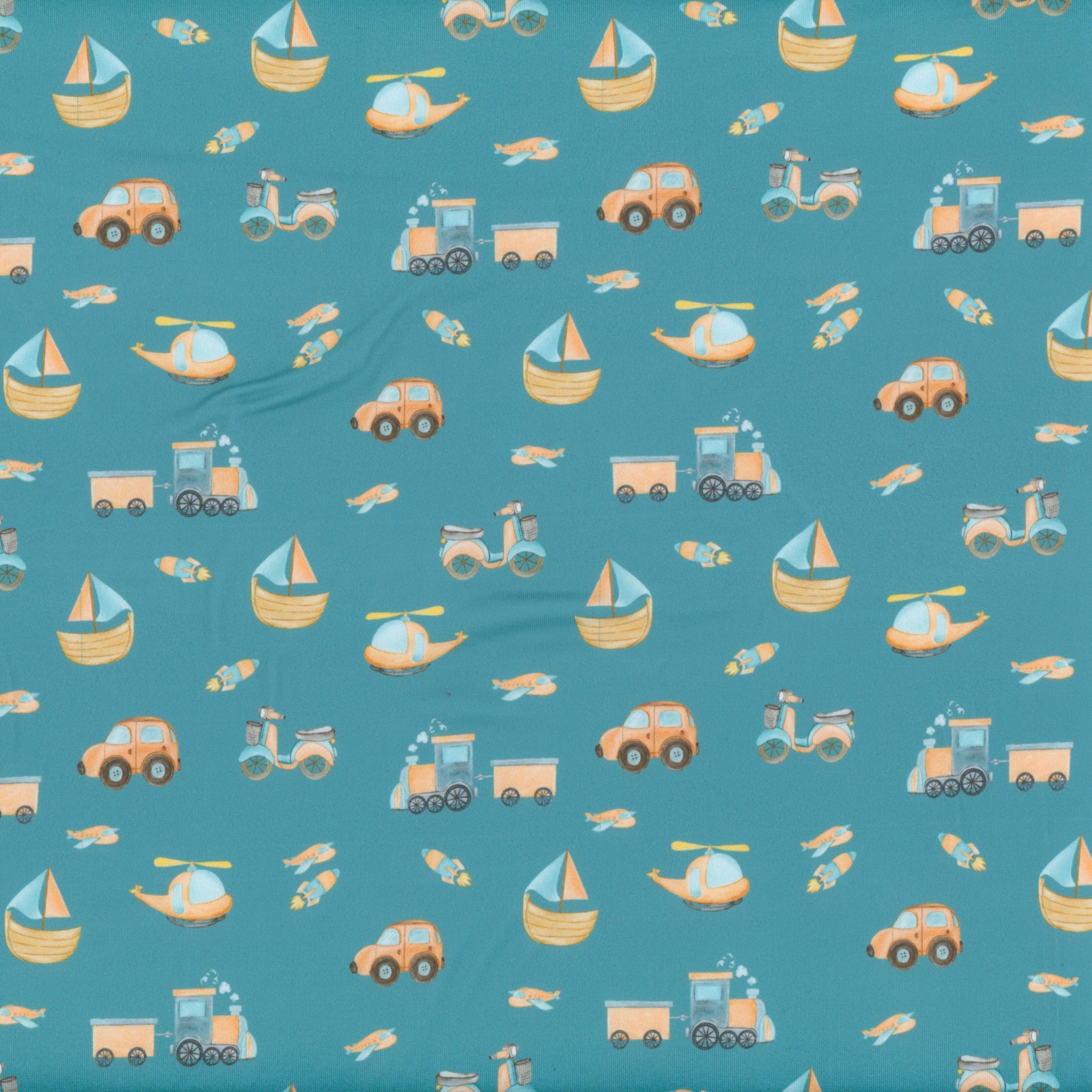 Accueil / Boutique / Tissus / Tricot de polyester brossé / Tricot brossé – Vroum – Aqua