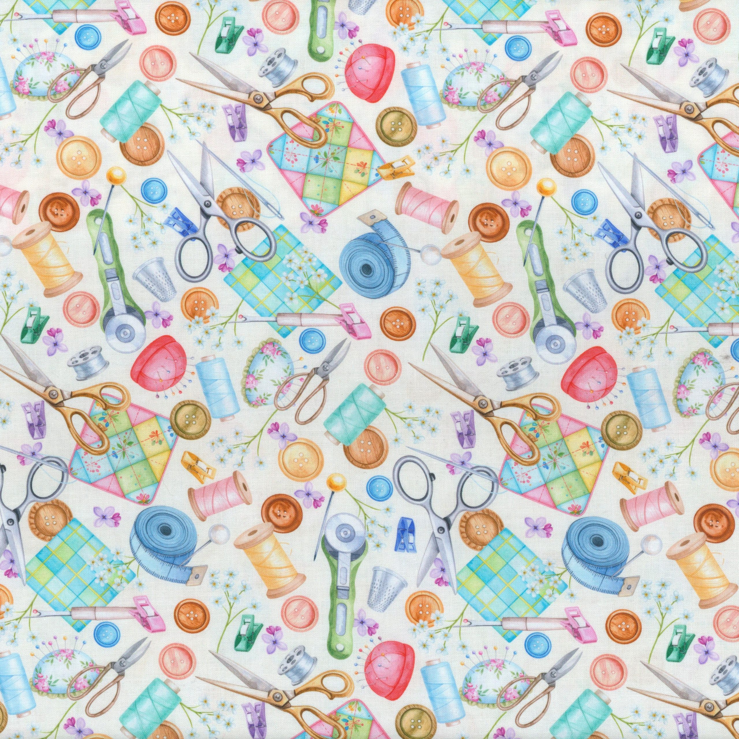 Accessoires de couture : ciseaux, bobines de fils, boutons, ruban à mesurer, etc
