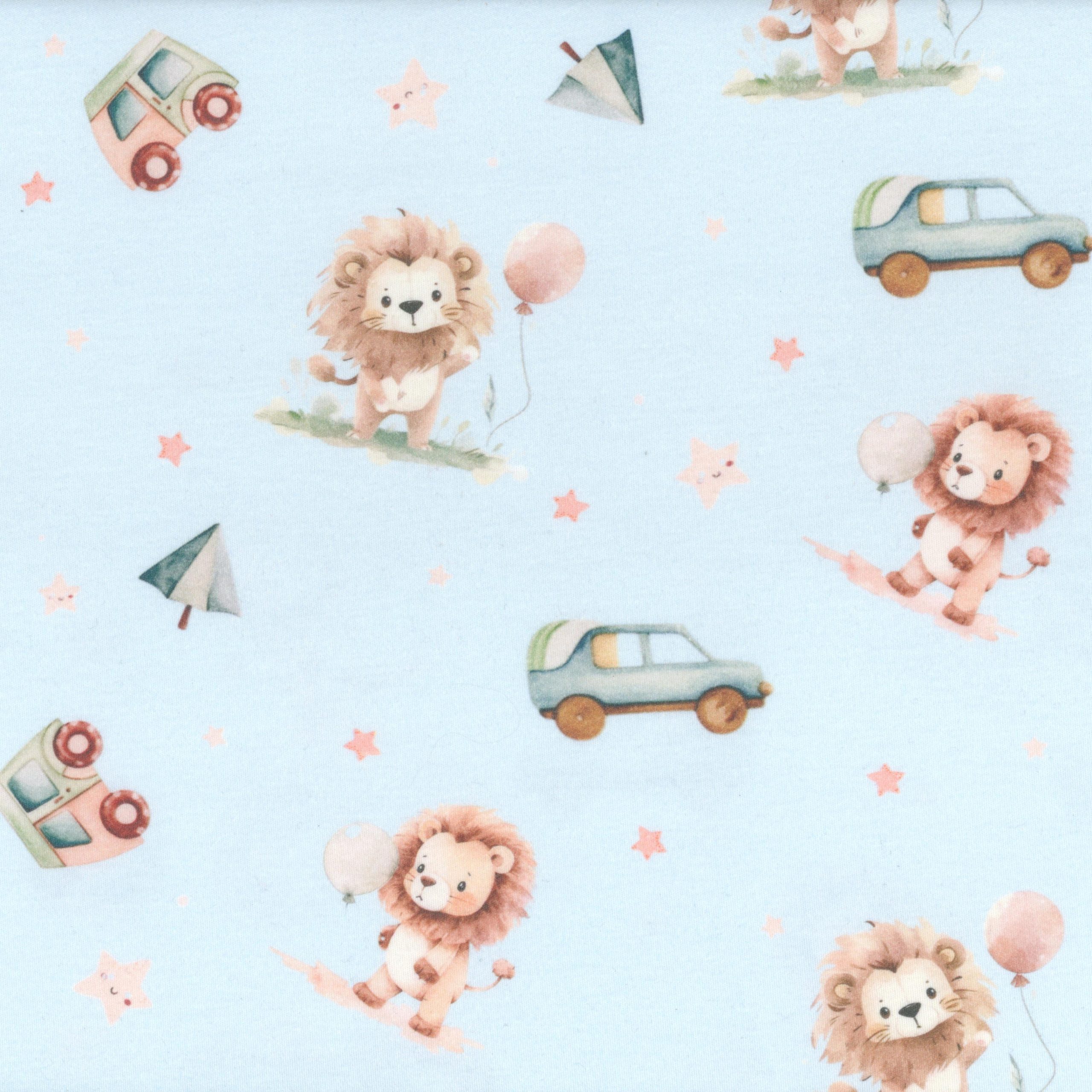Lions et voitures sur fond bleu pastel.